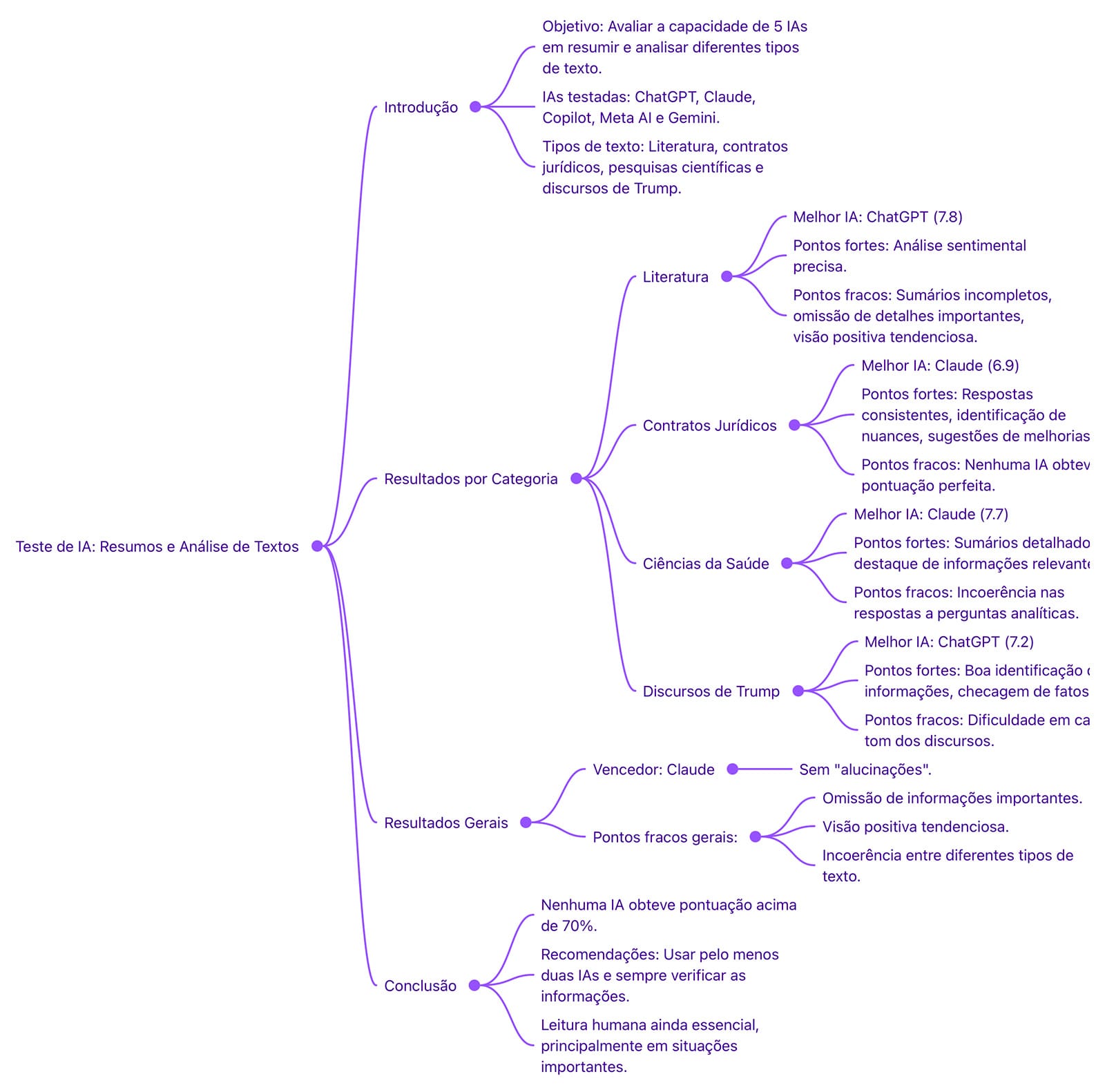 🏆 Vencedor e Conclusões: O chatbot Claude obteve a melhor pontuação geral, sendo o único que não apresentou "alucinações". No entanto, mesmo o melhor chatbot não atingiu uma pontuação acima de 70%, indicando limitações significativas. As inconsistências no desempenho dos bots em diferentes tipos de texto destacam a necessidade de cautela ao utilizar essas ferramentas. Os autores do estudo enfatizam que a IA não substitui a leitura humana, especialmente em situações que exigem precisão e análise crítica. Recomenda-se o uso de pelo menos duas ferramentas de IA para comparação de resultados e a leitura pessoal do documento para qualquer assunto de importância.