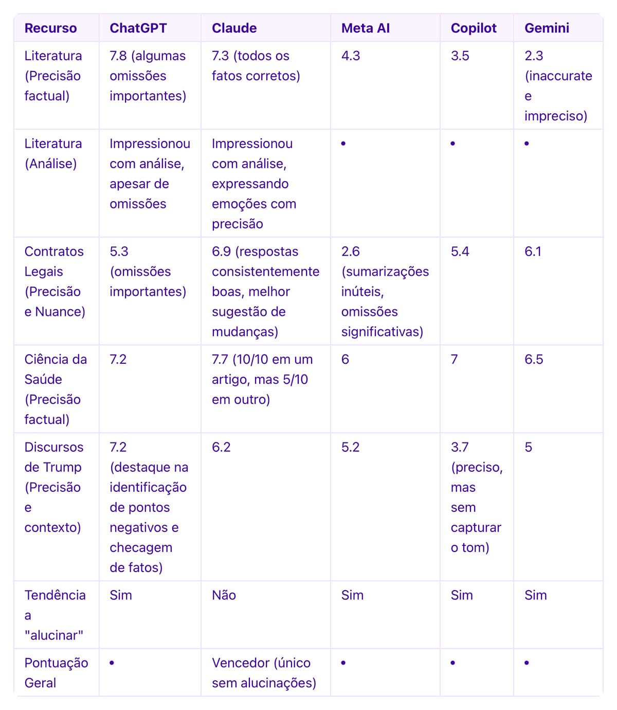 ⚠️ Alucinações: A invenção de informações ("alucinações") foi um problema recorrente em todos os chatbots, exceto o Claude. Isso demonstra uma limitação crucial na capacidade da IA de processar e interpretar informações com precisão. A falta de confiabilidade na informação gerada pela IA exige verificação humana para garantir a precisão dos dados.